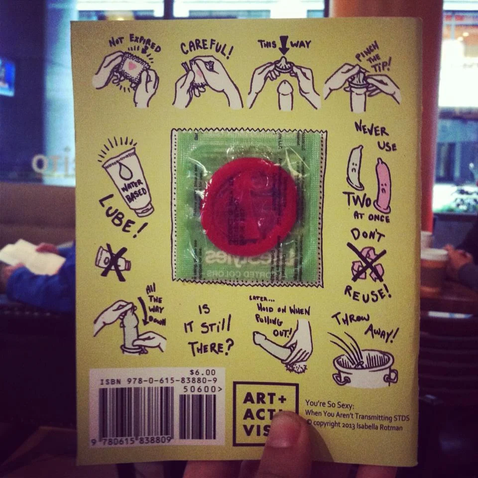 You’re So Sexy When You Aren’t Transmitting STD’s is a sexual health comic book. You're so Sexy was created in collaboration with the Wellness Center at the School of the Art Institute of Chicago to reform the humor and inclusiveness of safer sex guides. You’re So Sexy When You Are Not Transmitting STD’s is now being distributed to the student bodies of many schools, including The School of the Art Institute of Chicago and Columbia College Chicago. The book comes complete with a condom on the back cover and pertinent information on communication, consent, barriers, sexually transmitted diseases, and birth control.
